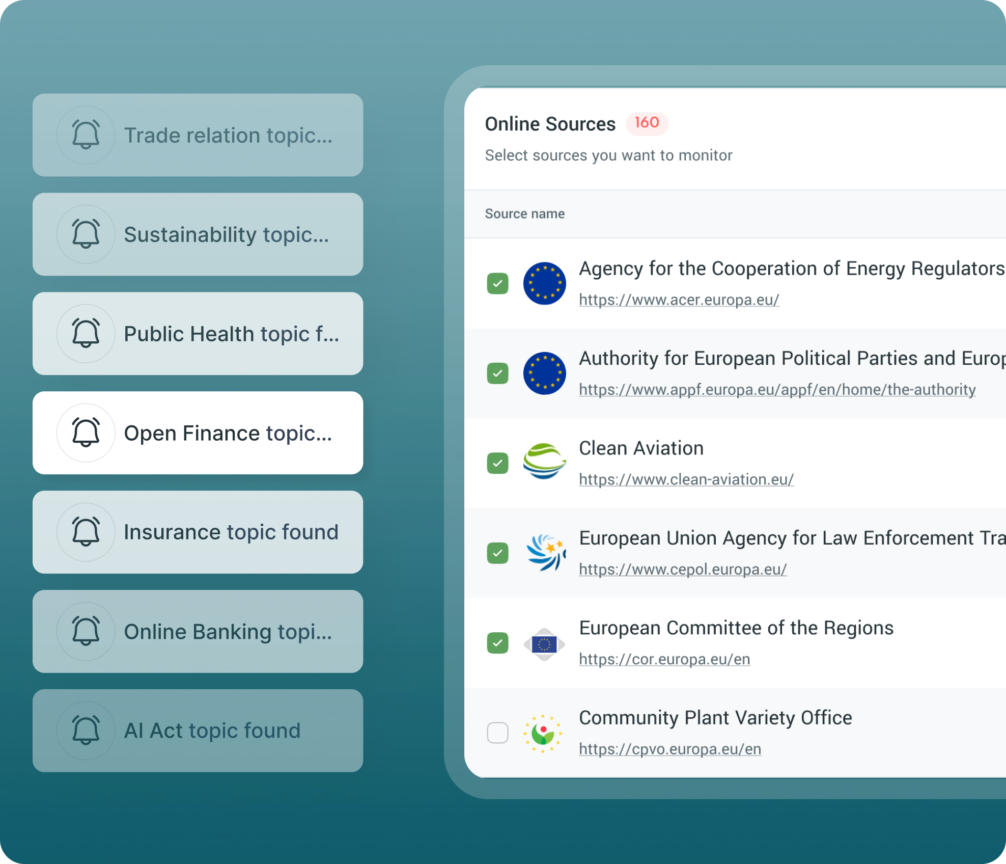 Yes, you can fully customise which topics, policy areas, and institutions you want to monitor based on your specific needs and interests.